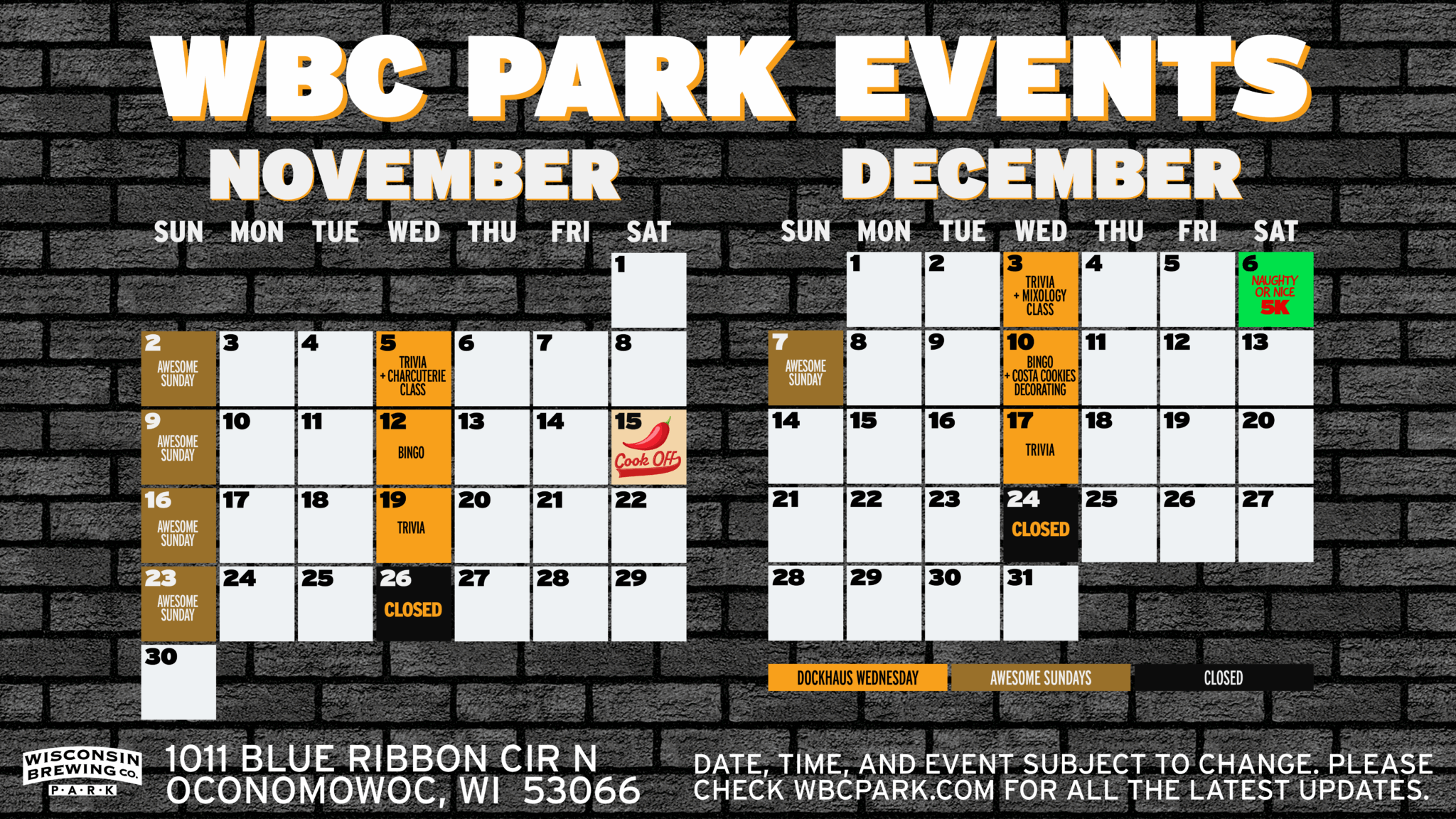 2025 SCHEDULE Make your plans to be at WBC Park all fall long. Live Music, Trivia, Bingo, and so much more! BADGERS FALL CLASSIC TAYLOR SWIFT TRIBUTE NIGHT Oktoberfest 2025 CHILI COOK OFF